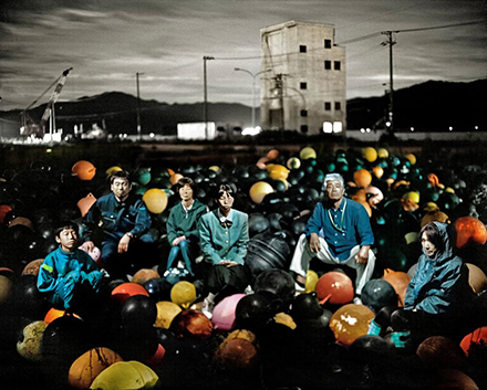 この作品展に展示される写真の多くは、モノクロの部分と独特の色調のカラーの部分が混在しており、不思議な雰囲気に包まれています。元の写真は、解像感を保つために大判のモノクロフィルム(4×5インチ)で撮影されたモノクロ写真です。そのモノクロ写真をデジタル画像として取り込み、デジタル処理で部分的に色をのせていきます。ある作品では、津波によって壊れた建物はモノクロで、そこに佇む人物などはカラーとして表現されています。それは、今を生きている命ある被写体には着色を施し、廃墟となった過去の記憶は元画像のモノクロのままにすることで、未来に向けて生きる住民たちの力強さを伝える作品になっています。自身が撮影したモノクロ写真に着色する色は、津波で流された水浸しの様々な写真に残っていた色をデジタル的に抽出して使っています。そこには氏の深い考えがありました。