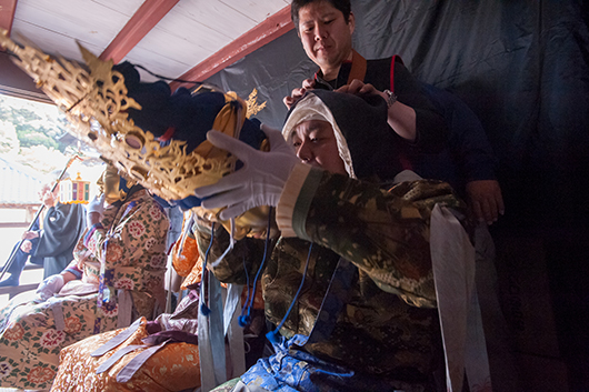 「特に儀式で重要な役割を持つ観音菩薩、勢至菩薩役を担えるのはわずか4名です。その方たちがある瞬間に恍惚とした表情を見せるのです。しかも、4名の方たちが全く同じように反応をするのです。金色に輝く菩薩面を装着する際に菩薩さまと一体になるほんの一瞬、瞳孔が開き面に演者が吸い寄せられるような瞬間に1000年という歴史の凝縮を感じるようになりました。写真として表現するのは難しいのですが、その瞬間を表現したくて撮影を続けています。この作品展で“その一瞬”を感じていただければ幸いです。」
