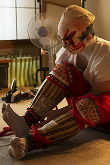 20代の兄弟は、顔(化粧)をし、衣裳をつけ拵えをする中で