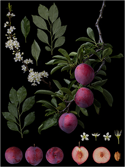 1)では、枝の剪定から収穫までの作業を丁寧に描き、その過程と共に果物の成長を追っていただけます。また、2)の羊皮紙の白い背景に写真でボタニカルアートのように表現した古典的な作品群と、3)の黒い背景に表現した緻密で現代的な印象の作品群との対比もお楽しみください。私の作品は、もともとボタニカルアートの表現に着想を得ていますが、当時の素材にもこだわり、紙が普及する以前の古代から中世にかけて主にヨーロッパや中東で使用されてきた羊皮紙にもプリントしています。ボタニカルアートとは、まだ写真のない時代に植物学者と画家が連携して、正確かつ精緻にその植物の姿を描写したものです。19世紀にはその絵が芸術的にも非常に評価され、主にヨーロッパで流行しました。羊皮紙は、羊や仔牛などの動物の生皮を木枠に張って伸ばし、ナイフで削るなどして薄くして乾燥させ、表面は描画や筆写に適するよう加工されています。他にも、コットンペーパーなどさまざまな用紙にプリントした作品を展示します。また、黒い背景の作品には自ら交配育種した品種や、2年連続でSony World Photography Awards(ソニーワールドフォトグラフィーアワード)一般公募部門 静物カテゴリーのショートリスト(入選)に選出された2作品も出展します。