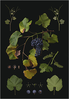 長野県塩尻市にて営む果樹園で自ら育てた果物を中心に撮影し、生産者だからこその視点や知見を生かしながらボタニカルアートのような精緻な描写と美しさをめざして、果物の最も美しい姿を追求しようと作品づくりを続けています。本作品展では新作も含めた3つの作品群、1)ぶどうや梨など果物の収穫までの生育過程を大きく1枚に表現した作品群、2)羊皮紙へプリントしボタニカルアートのように仕上げた作品群、3)黒い背景に果物品種の特性を表した作品群を展示します。