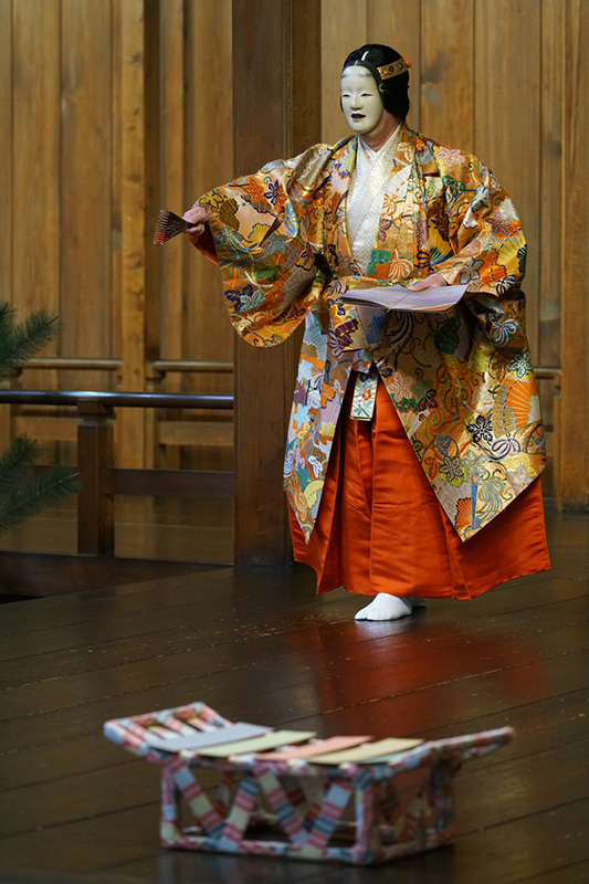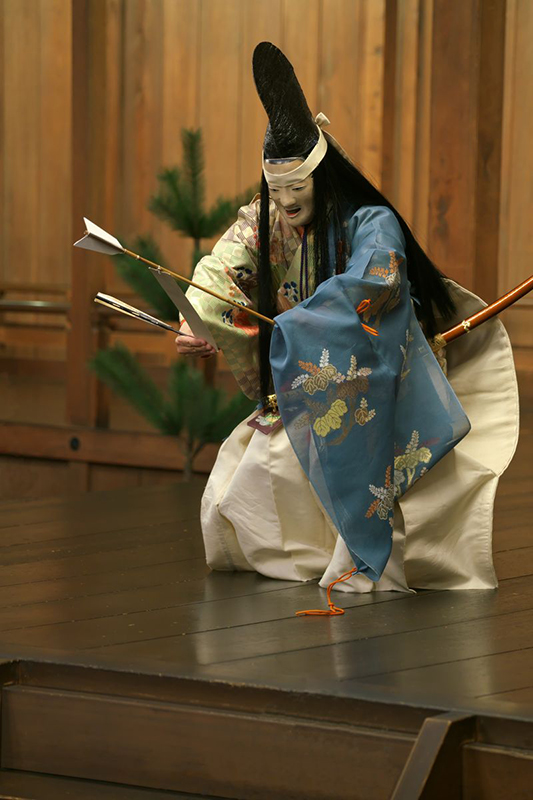 「能楽(能狂言)」の歴史は古く、奈良時代(8世紀)に中国や西域の国より伝わった「散楽」が日本の雑技と結びつき、その後「田楽」「今様」「白拍子」等を取り込み、歌舞的要素が加わった一種の楽劇「猿楽」に発展しました。室町時代(14世紀)に入ると、足利将軍家の援助のもと大和猿楽の観阿弥・世阿弥父子が今日に伝わる「能」を確立させました。その後の権力者たちも「能楽」を援助し、江戸時代に四座一流(観世・宝生・金春・金剛・喜多)体制が確立、明治時代になるとそれまでの呼称「猿楽(申楽)」が「能楽」に改められました。装束・面・楽器も一流職人の手によって美術品・工芸品として発展し、現在でも室町時代や江戸時代につくられた装束や面が使用されています。