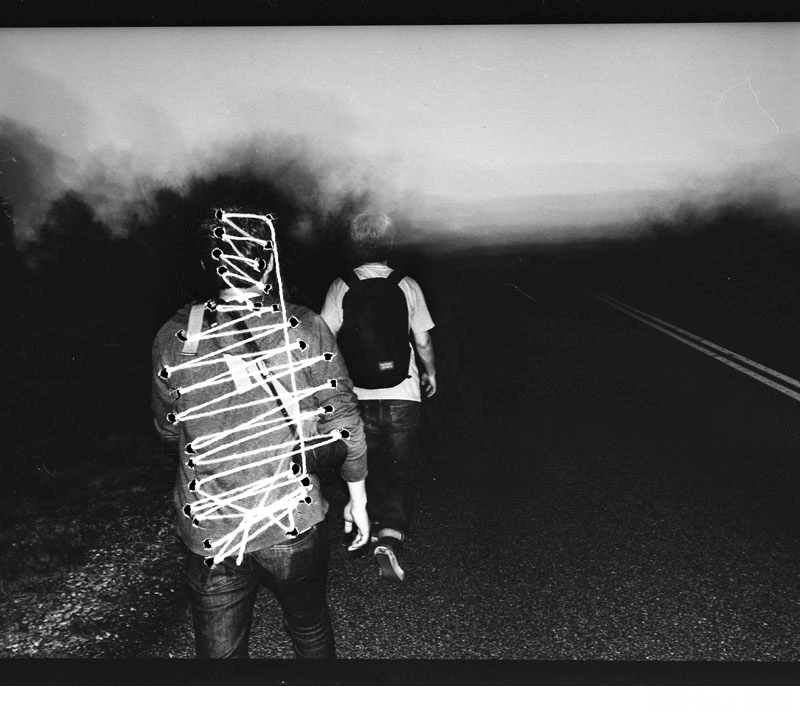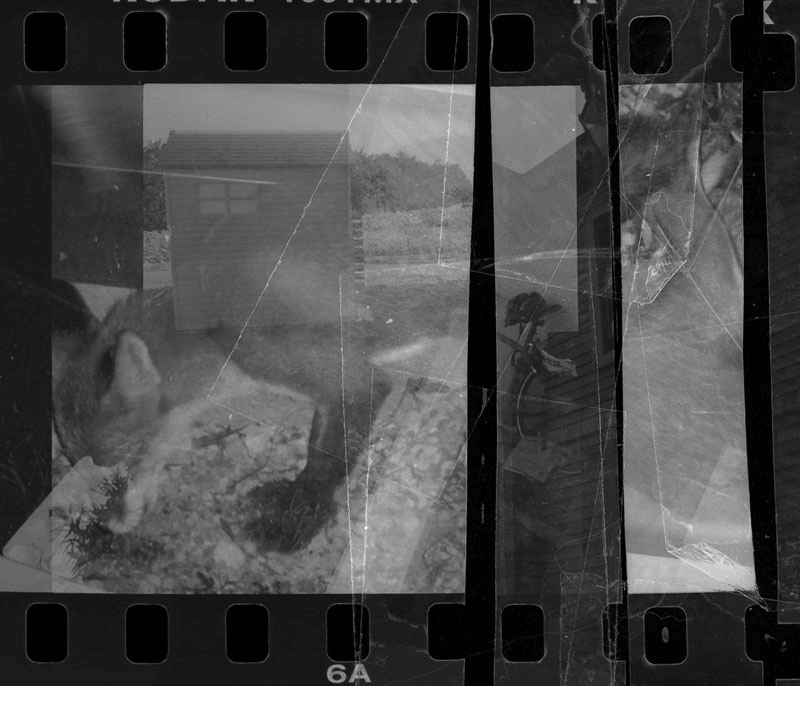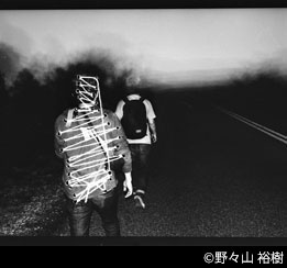 ネガフィルムを再構成するという手法は、近年の二つの荒木経惟(1940〜)の作品に影響を受けています。一つ目は2011年出版、『写狂老人日記』。モノクロフィルムを削り、そのフィルムをプリントして集めて一冊の写真集を作った作品です。二つ目は、2014年荒木経惟の写真展「切真」(きりしん)の図録です。この写真展はカラーポジフィルムのイメージを半分切って、また別の切られた半分のフィルムと組み合わせた作品でした。野々山も手作業でフィルムを重ねて繋ぎ合わせる手法を使用することでイメージの層と物質性を表現しています。
