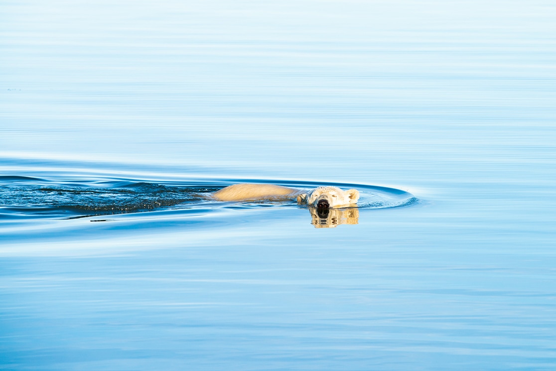 キラキラと輝く太陽を受けて泳ぐホッキョクグマの波紋だけが水面を揺らす。