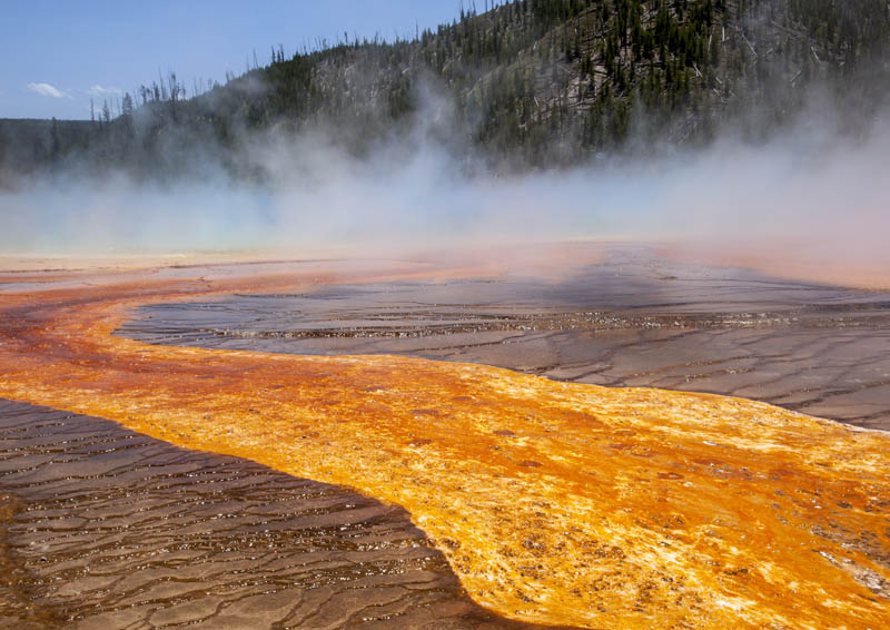 熱水活動は、その水分量によって活動形態が異なり、水分量の多い順に(1)熱水プール、(2)間欠泉、(3)泥火山、(4)噴気孔の4種類に分類されます。 好熱性バクテリアに着色された色とりどりの熱水プールから溢れ出る温泉水、突然高く吹き上がる間欠泉、泥水を弾き飛ばして怒っているような泥火山、とイエローストーン国立公園は見所満載です。普段は動きが見えない地層や岩石を扱っている私にとって、大地の躍動を肌で感じられるイエローストーン国立公園の熱水活動は、驚きと感動の連続でした。本作品展にて、自然の偉大さ、生きている地球の姿を感じていただければ幸いです。