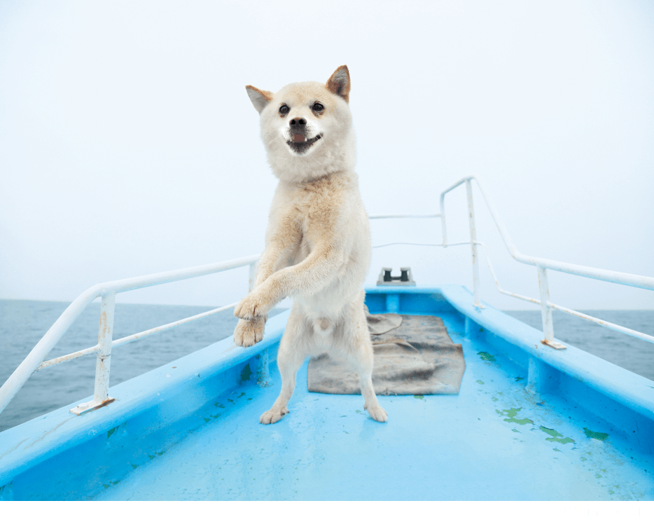 タロウには”漁師犬”という、もうひとつの顔があります。キンちゃんと一緒に船に乗り、餌の魚を横取りしようと空から現れるカモメを追い払う仕事です。いやはや普通の犬ではありません。