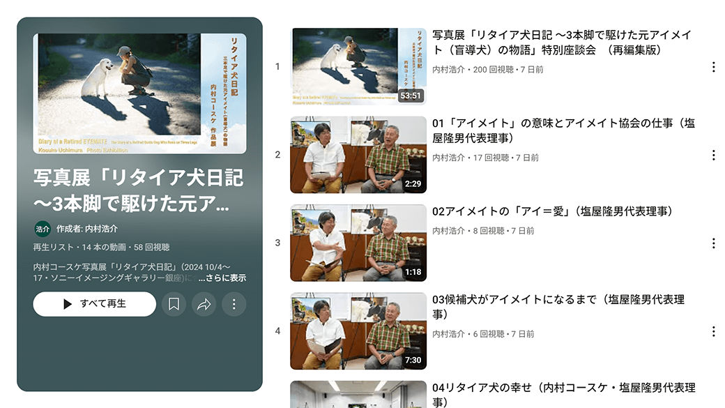 「リタイア犬」とは、アイメイト(盲導犬)を引退して奉仕家庭に引き取られた犬たちのことです。本写真展の主人公「マルコ」は、そんなリタイア犬の一頭です。10歳でアイメイトとしての役目を終え、2019年9月から2023年10月に亡くなるまで、我が家で家庭犬として過ごしました。最初の出会いでマルコの優しい瞳を見た瞬間、私は写真家として、シャッターを切らずにはいられませんでした。以来、マルコと過ごした4年間の日々を、毎日欠かさず、日記のように写真に収めました。その集大成が本写真展です。
